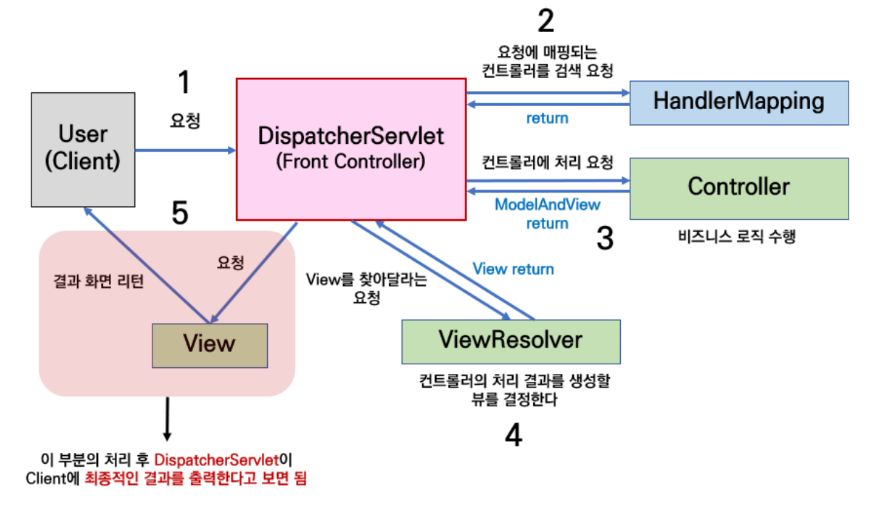 웹브라우저 ➡ DispatcherServlet ➡ Controller ➡ 모델 앤 뷰 ➡ Controller ➡ DispatcherServlet ➡ 웹브라우저