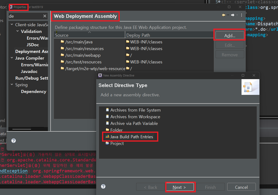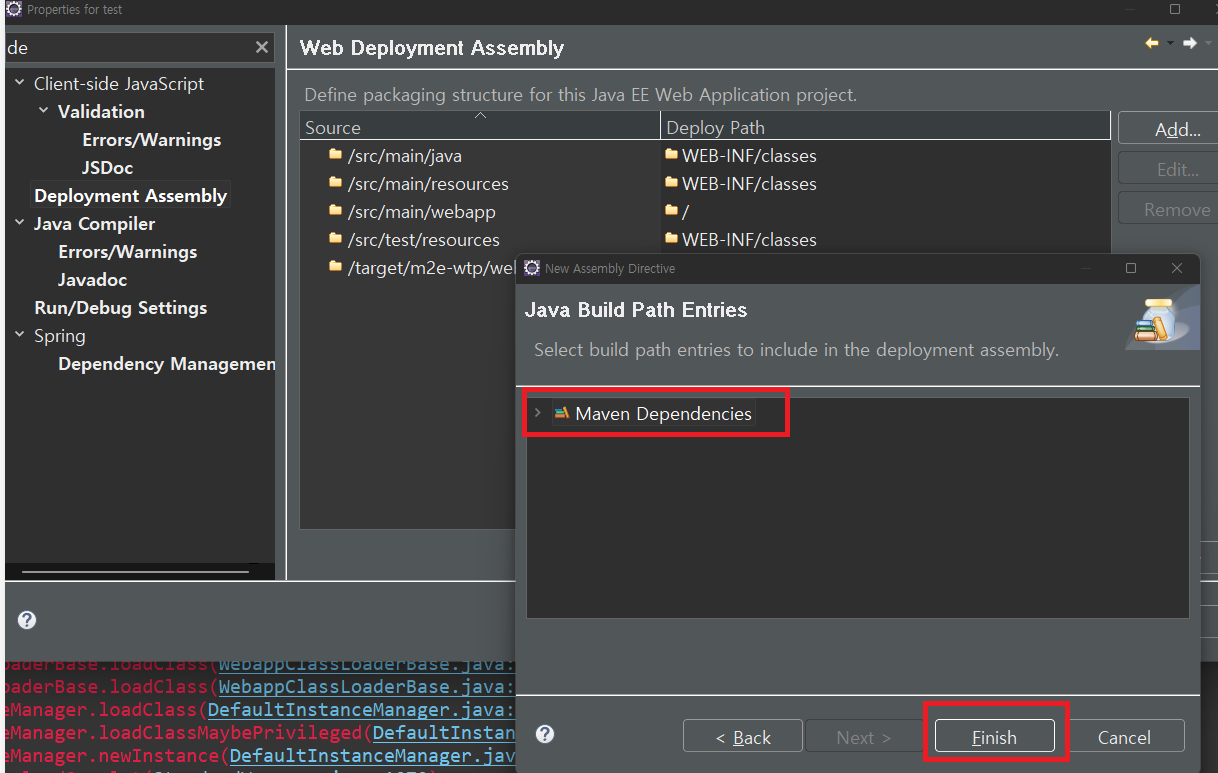 ClassNotFoundException 해결 방법 : 프로젝트 우클릭 -> properties -> Deployment Assembly -> 우측 Add -> Java Build Path Entries -> Maven Dependencirs 클릭 후 Finish