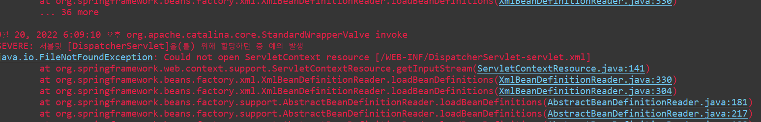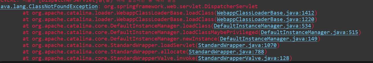 web.xml 변경 후 서버를 돌려보면 하기와 같이 ClassNotFoundException이 발생