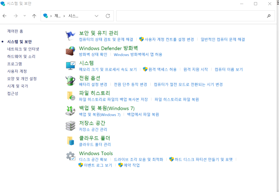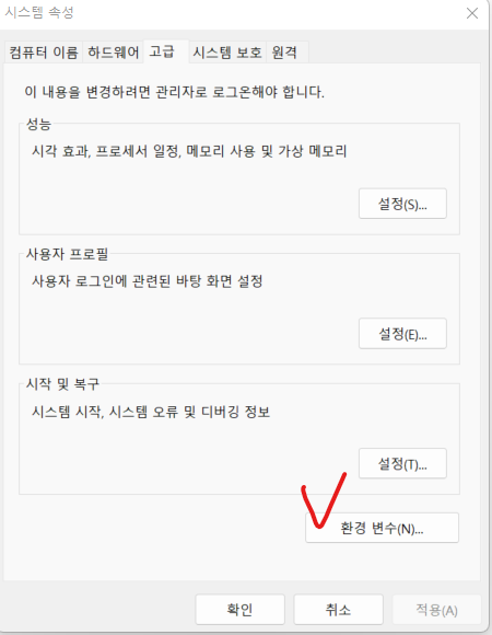 1. 제어판 -> 시스템 -> 고급 시스템 설정