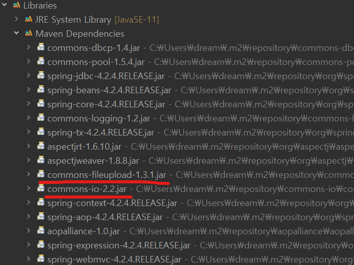 위에 사용한 MultipartFile을 사용하려면 FileUpdate 라이브러리(.jar) 추가해야한다.