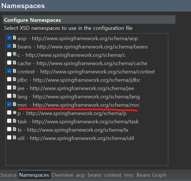 DispatcherServlet-servlet.xml 파일 Namespaces에 mvc를 선택한다.