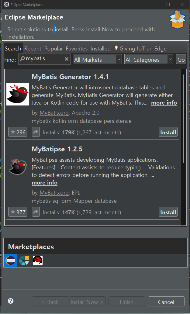 이클립스 상단의 Help -> Eclipse Marketplace-> mybatis 검색 후 검은새가 보이는 하기 2가지 플러그인을 설치 한다.