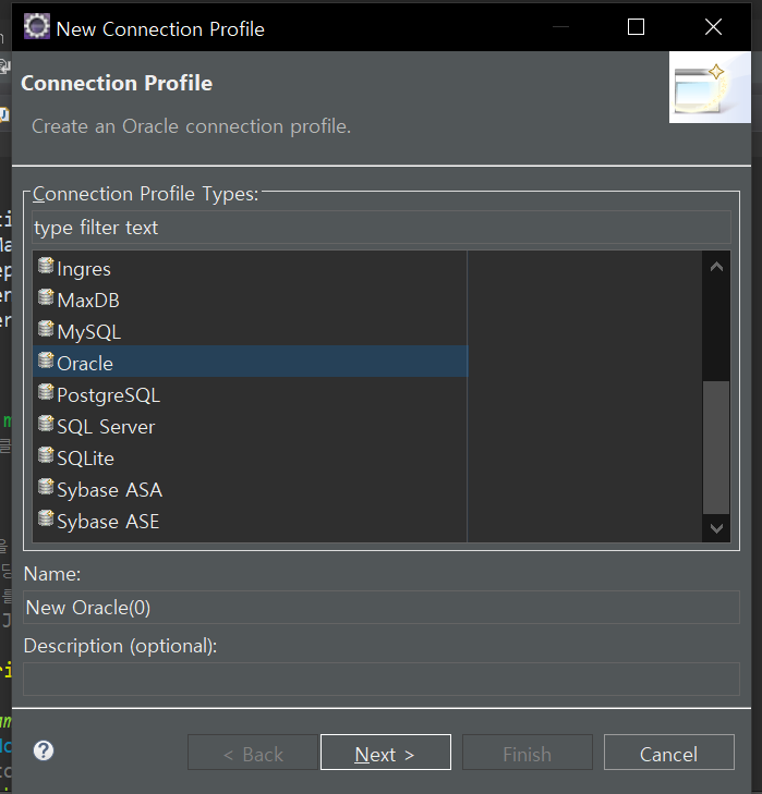 database connection-> 우클릭 뉴 ->oracle -> next ->