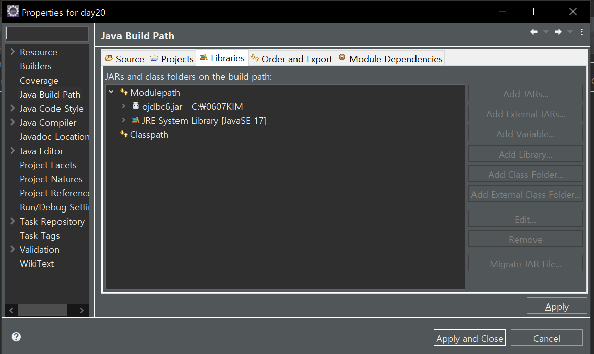 -> 설치한 odjbc6.jar -> Aplly and Close
