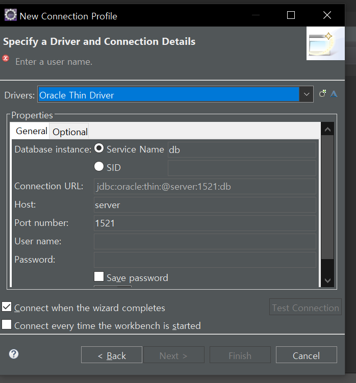 service name=xe로 입력 -> Host=localhost -> Port number 바꾸지않고 그대로 사용함 ->