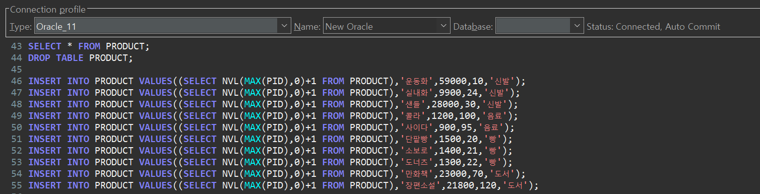 stmt.executeQuery("INSERT INTO PRODUCT VALUES((SELECT NVL(MAX(PID),0)+1 FROM PRODUCT),'"+name+"',"+price+","+cnt+",'"+category+"')");