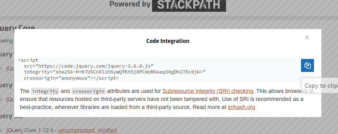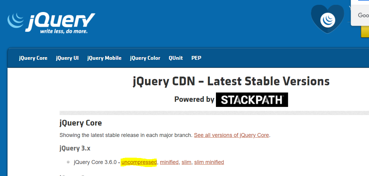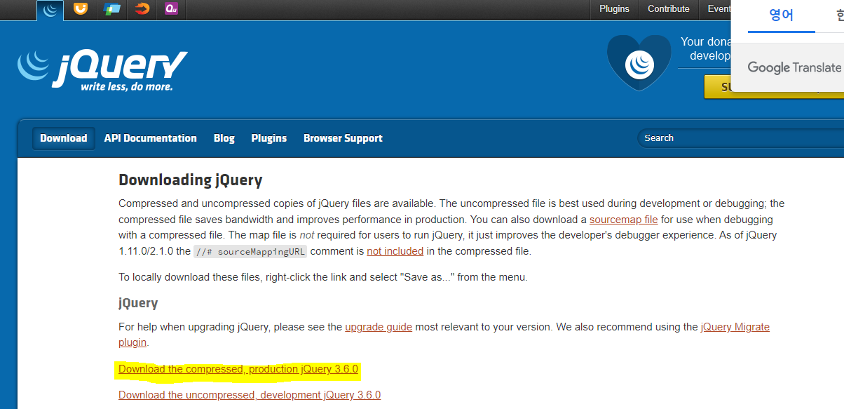 1. https://jquery.com/download/ 사이트 접속 후 설치하고자 하는 태그 복사하여 사용