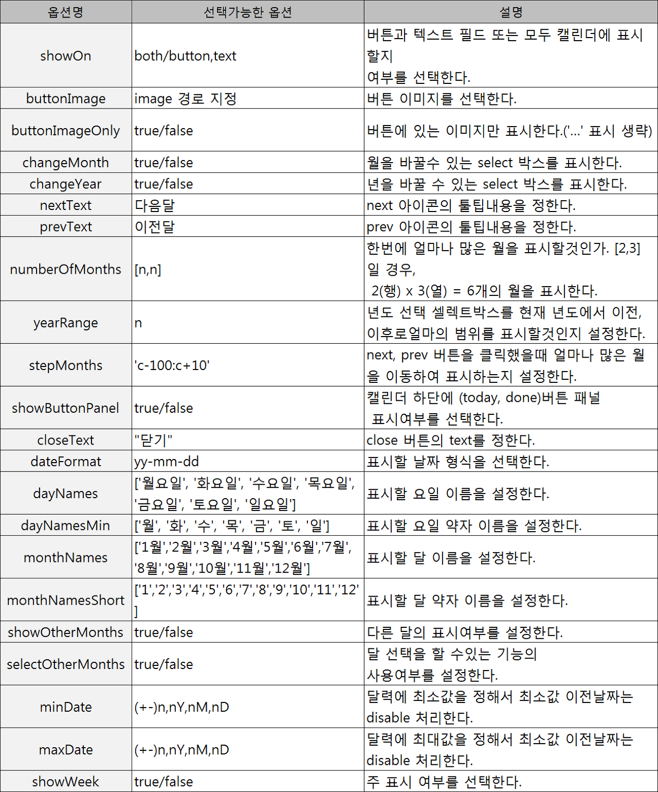 script 단에 datepicker의 옵션을 추가하게 되면 여러가지 기능을 가진 datepicker UI를 사용 가능
