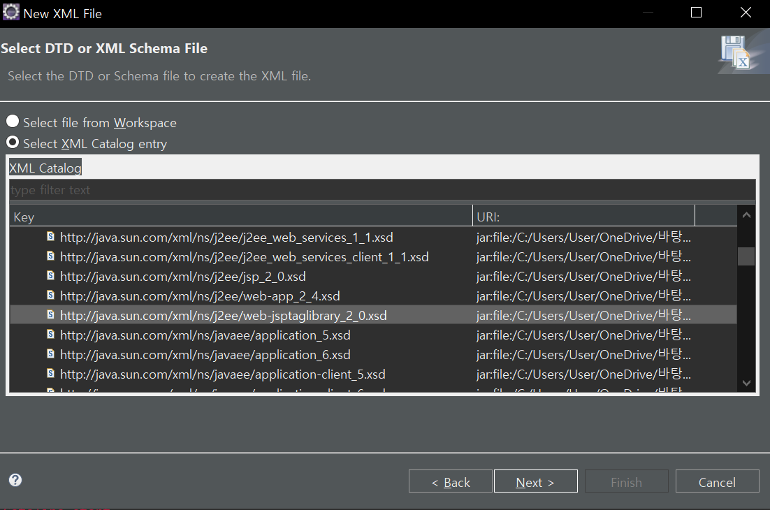 Select XML Catalog entry를 선택한 후 http://java.sun.com/xml/ns/j2ee/web-jsptaglibrary_2_0xsd를 클릭