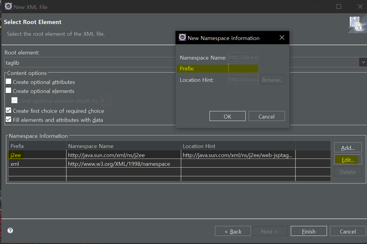 j2ee가 <no prefix>로 표시되도록 클릭 후 Prefix에 기입된 내용을 지워주고 OK버튼