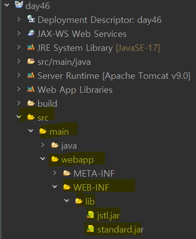 첨부된 두 라이브러리를 WEB-INF파일 내부의 lib파일에 추가한 후, 페이지 지시어인 taglib로 사용할 라이브러리를 선언